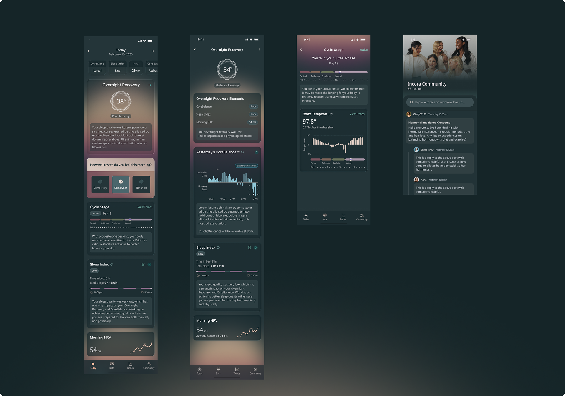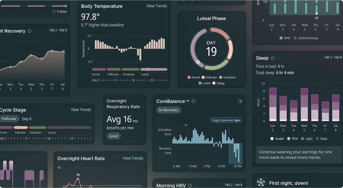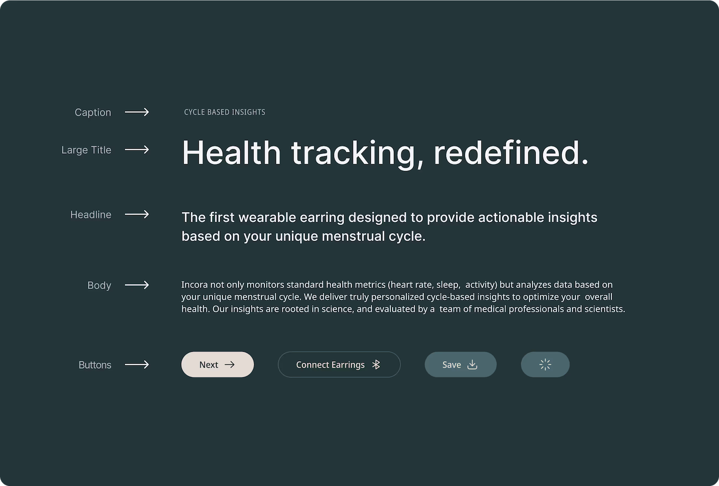 Incora is the first wearable earring designed to provide personalized health insights based on the menstrual cycle, leveraging in-ear sensors for highly accurate data on heart rate, sleep, and activity. Led the visual and product design for the connected app, driving creative direction, building functional prototypes, designing data visualizations, and delivering a robust UI Kit. Our work helped translate Incora’s groundbreaking science into a user-friendly experience, empowering women to better understand and optimize their health.