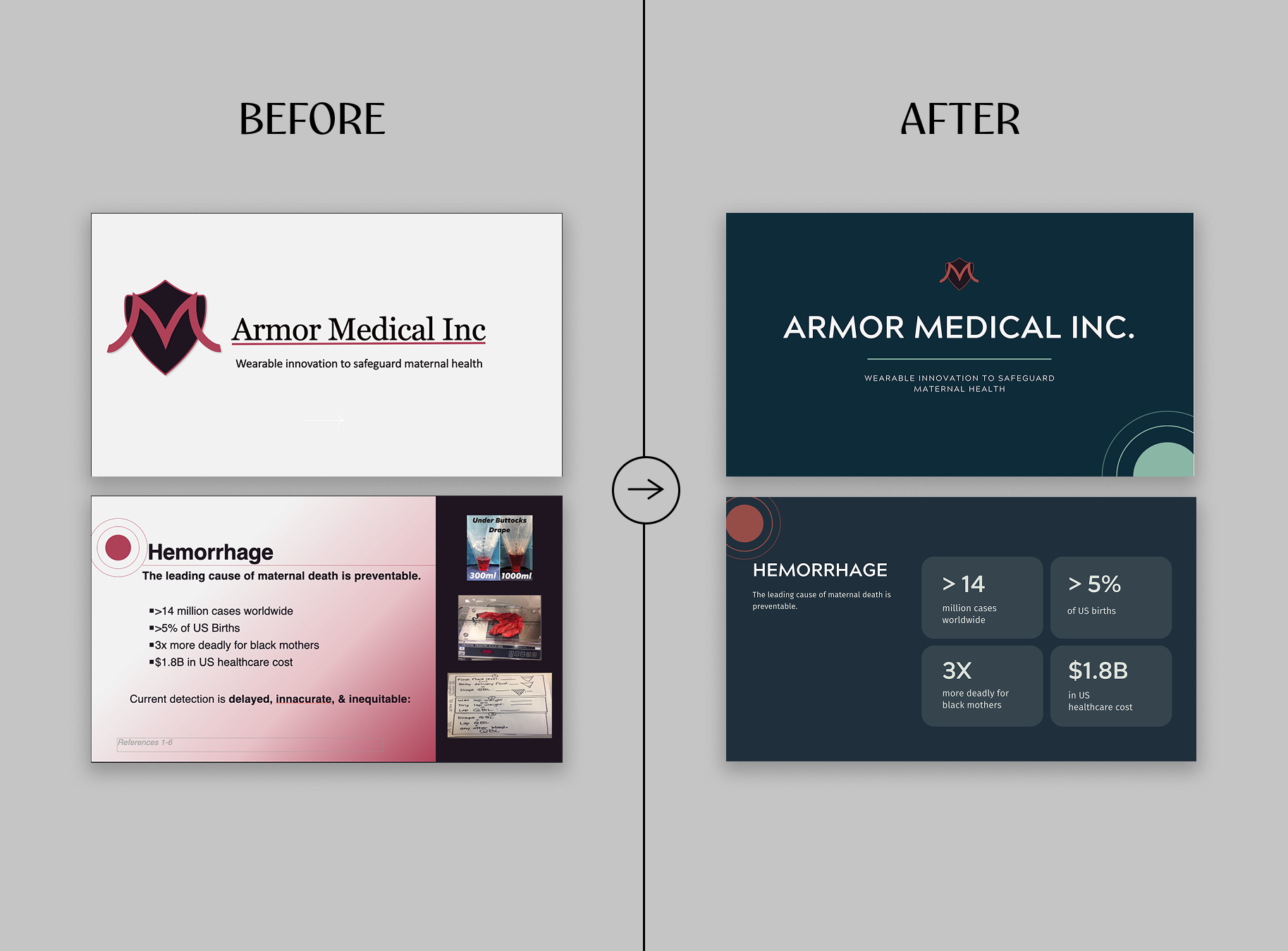 Armor Medical is a seed-stage company developing innovative, research-backed technology to help prevent maternal deaths. I wanted to design a refreshed visual identity and slide deck system that made their story simple, accessible, and compelling for investors. The new deck communicates the same expertise and credibility as their medical device, while making the complex subject matter clear and engaging. This alignment of brand and product helps Armor Medical present with confidence as they secure the funding needed to scale their impact.