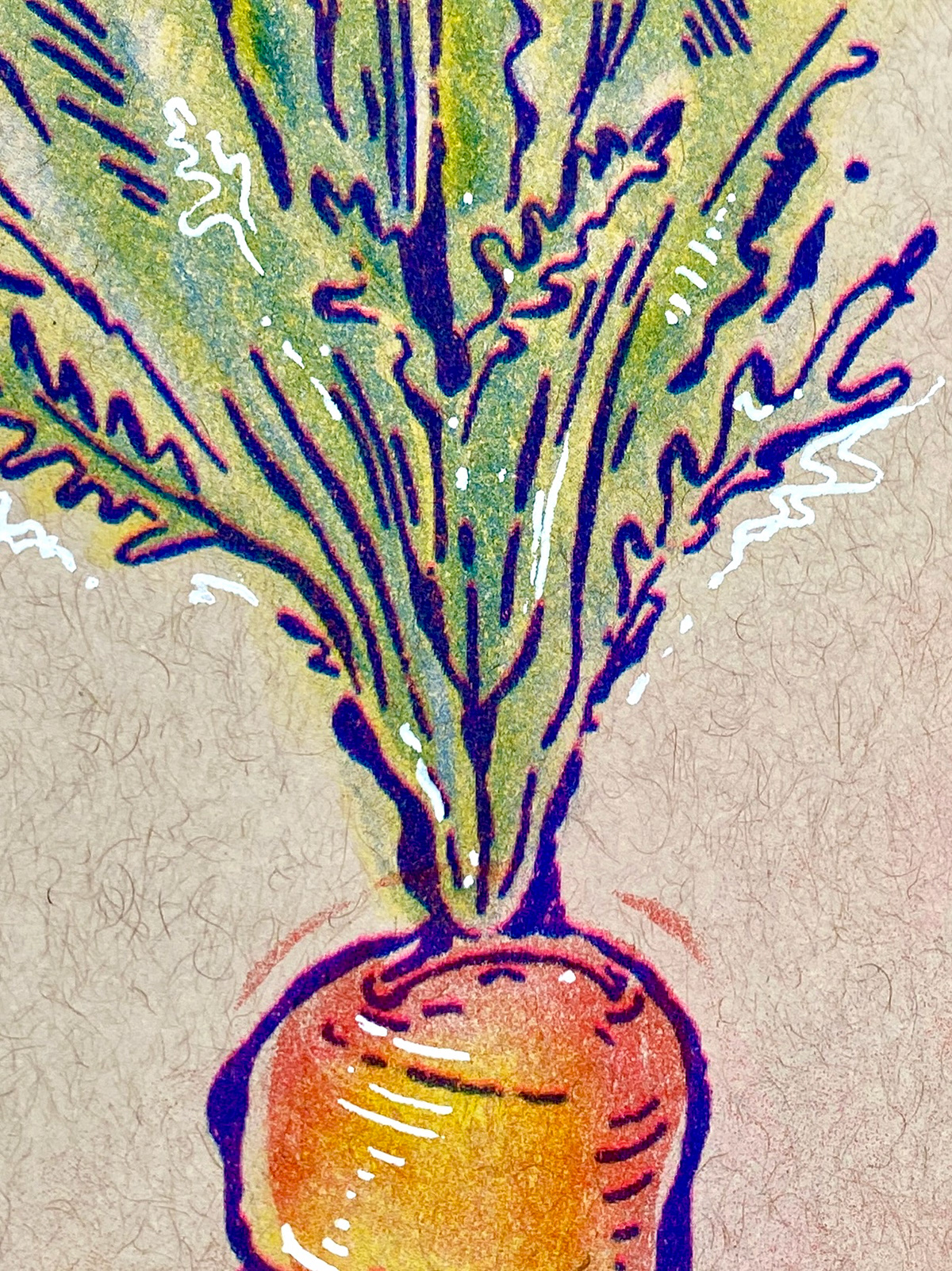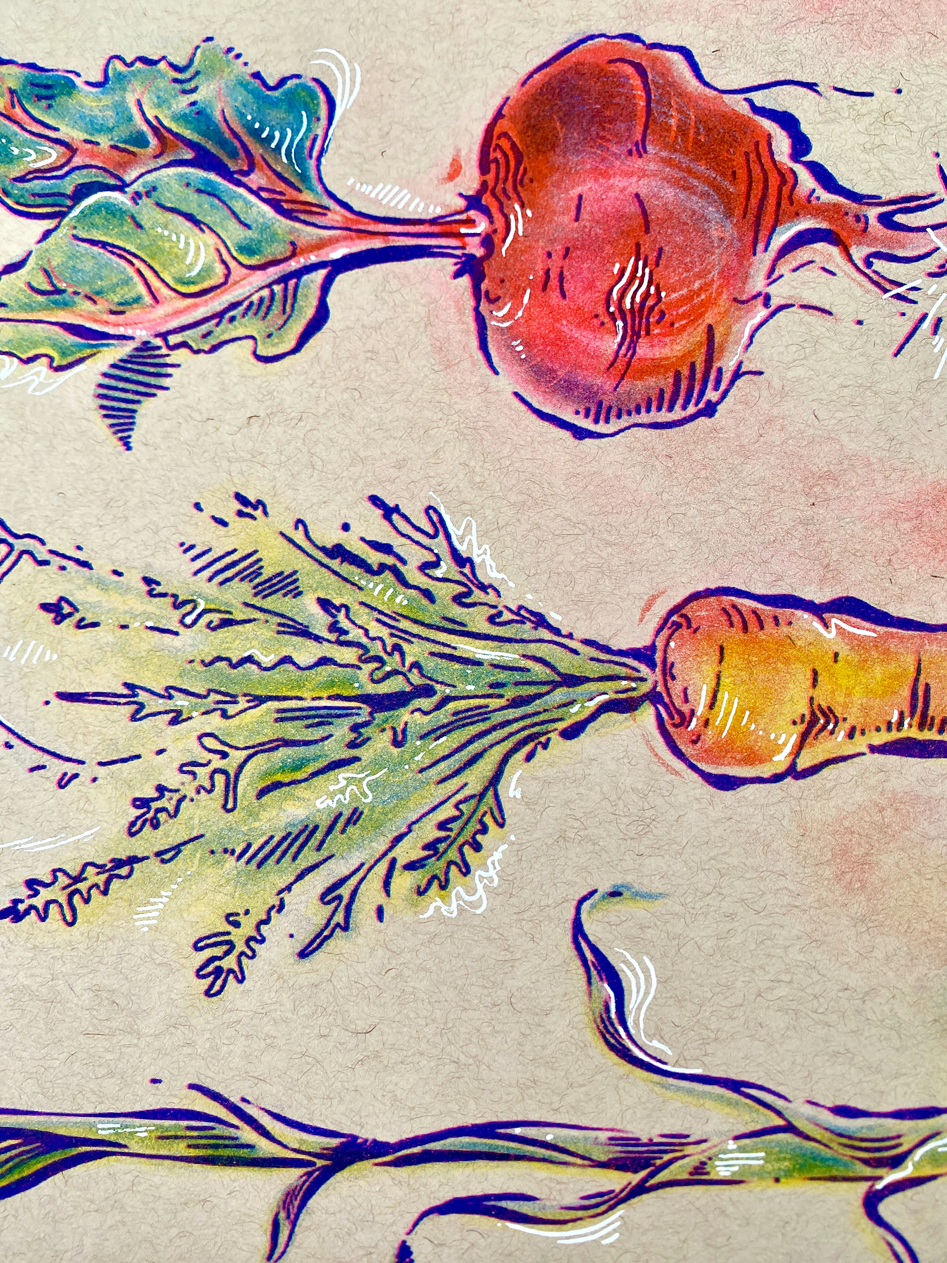 3 color risograph print 🥕🫚 (florescent pink, yellow, blue) with white hand details